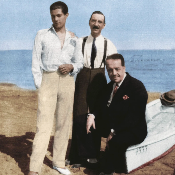 這張攝於1927年威尼斯的照片,從左至右分別是謝爾蓋·利法爾(Serge Lifar)、沃爾特·努維爾(Walter Nouvel)和謝爾蓋·迪亞吉列夫(Sergei Diaghilev)。他們三位都是俄羅斯芭蕾舞團的核心人物。迪亞吉列夫是創辦人,利法爾是最後一位明星舞者,而努維爾則是迪亞吉列夫的摯友和公司秘書。這三位藝術家共同創造了芭蕾史上重要的黃金時代。