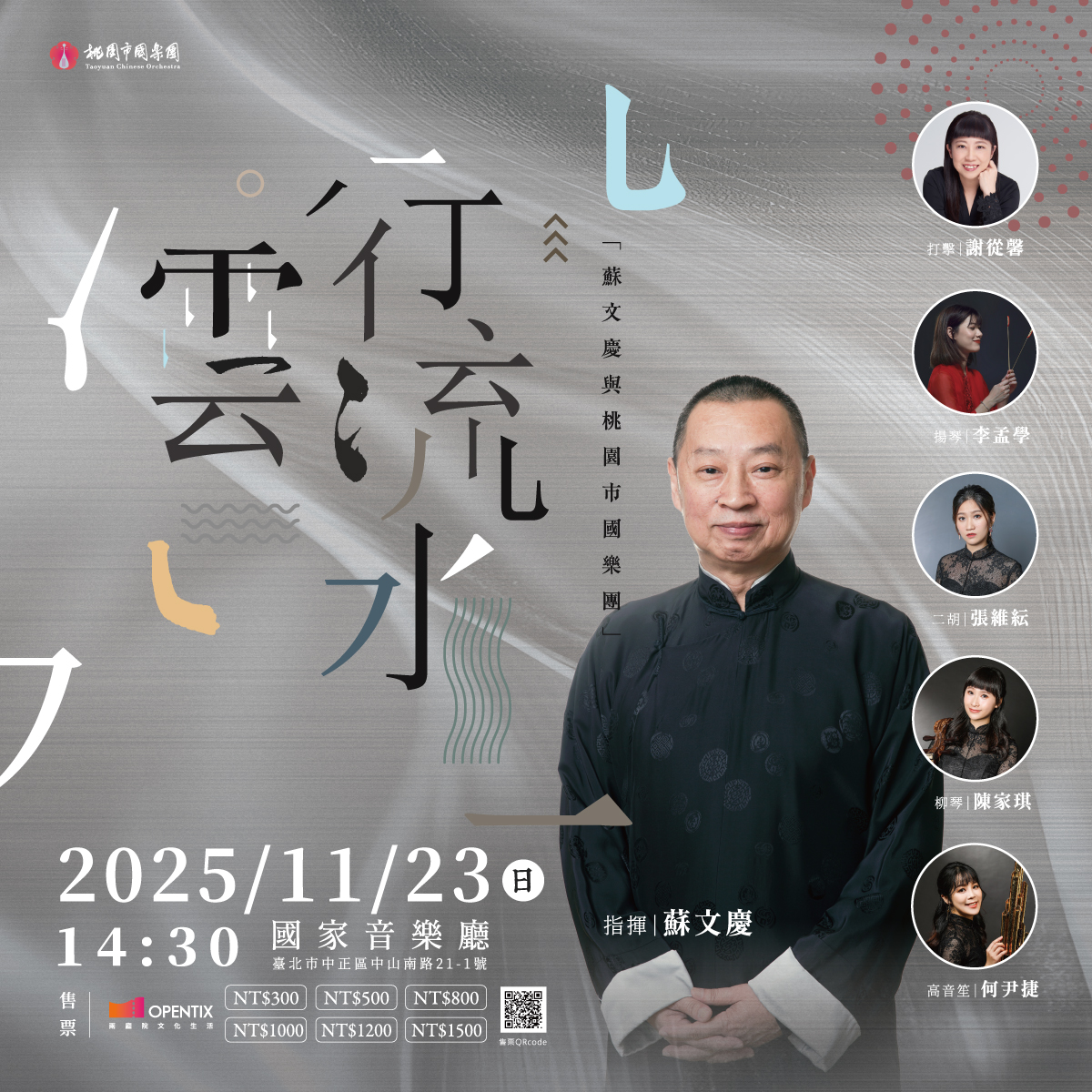 指揮家暨作曲家蘇文慶老師作品專場《行雲流水》 率領桃園市國樂團與演奏家張維紜、謝從馨、李孟學、何尹捷、陳家琪等優秀且獨具風格的協奏者們,同場詮釋經典樂曲經由蘇文慶老師細膩深刻的雕琢,邀您隨著旋律的脈動親歷音樂深處的對話與創作的想像。